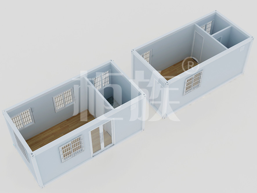 Materials: corner columns and main beams are galvanized cold-rolled steel, secondary beam is galvanized square tube, wall panel is glass wool sandwich panel, magnesium board as base of the floor, PVC decorative panel. Plastic steel window, steel door, 6 ㎡ electrical cable