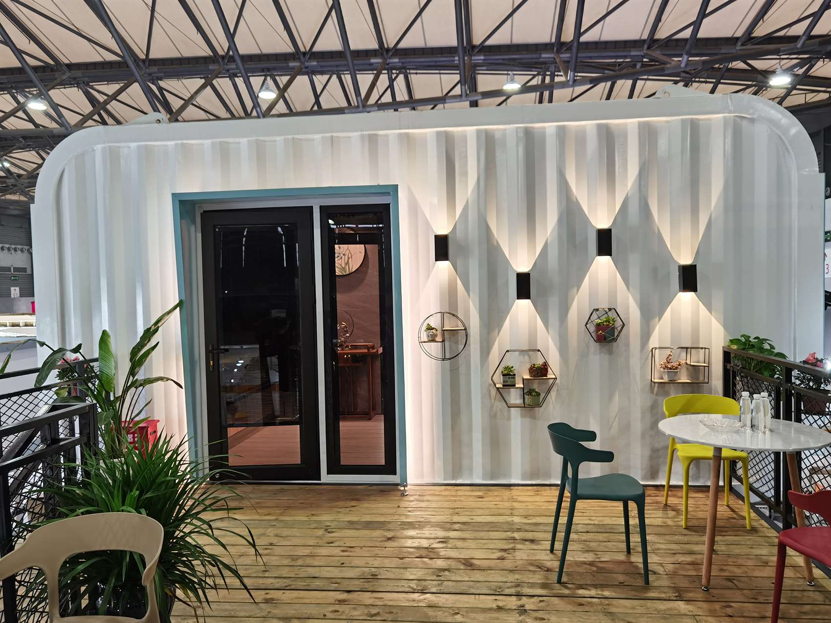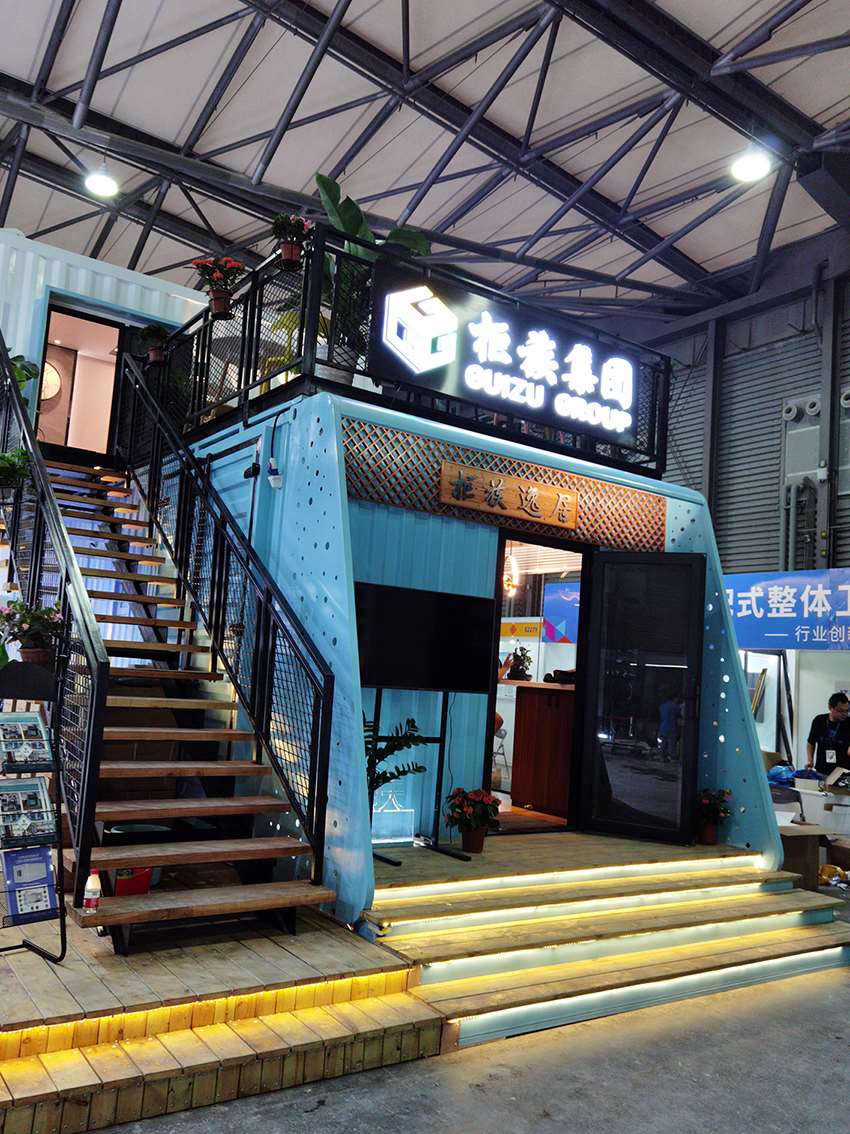 柜族本次參展的產品——逸海小筑位于E2裝配式建筑展區(qū)的2269展位,是一款以藍白為主色調、融入了水與波浪元素的海洋風集裝箱別墅。該產品的設計理念為環(huán)保、舒適、旅居,以不破壞場地與自然環(huán)境為出發(fā)點,整個產品為工廠預制完成,地面抬高3個臺階,有效隔離了地面的潮氣。箱子著力點有圓柱支撐,底座圓盤加大了受力面積和整體平衡性。箱子整體分為一、二層兩個模塊,用吊機和平板車整體裝卸運輸,在選好的平整地面直接擺放就可以入住使用了。